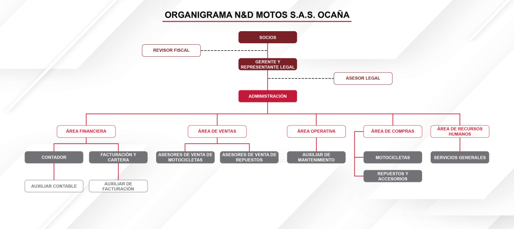 En N&D Motos S.A.S. Ocaña contamos con una estructura jerárquico–funcional que se adapta al tamaño y necesidades de la empresa, definiendo con claridad los niveles de autoridad, líneas de comunicación y responsabilidades específicas. Este modelo nos permite optimizar los procesos internos y garantizar una gestión eficiente.